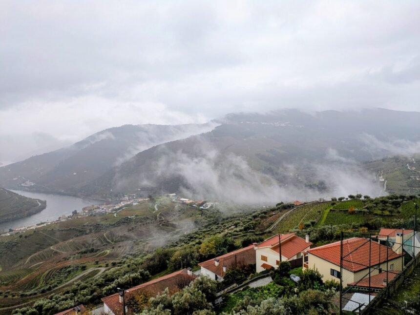 A misty Douro Valley road trip—dramatic foggy views from Casal de Loivos, a quiet stop in Pinhão, and the stunning riverside drive to Régua.