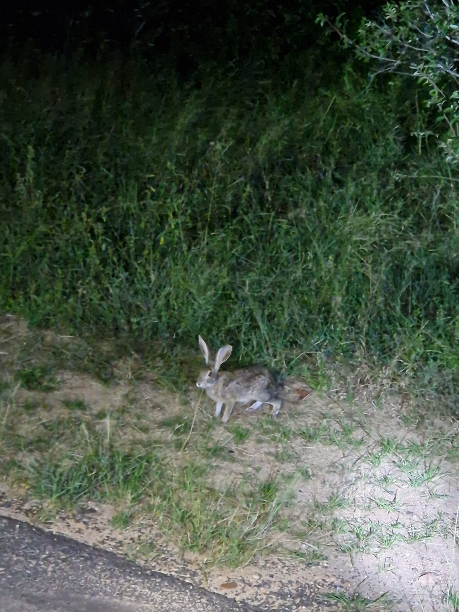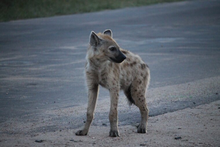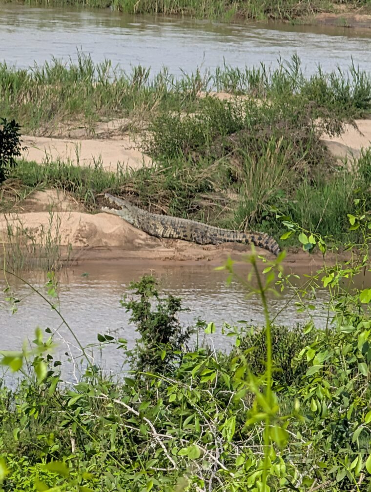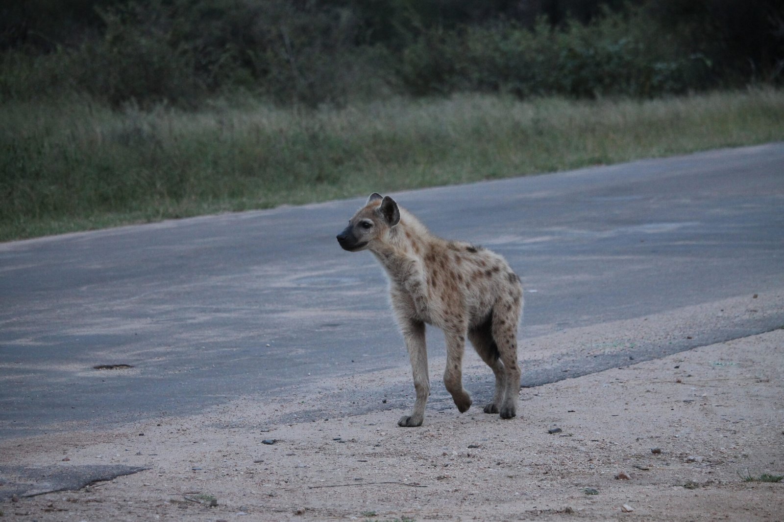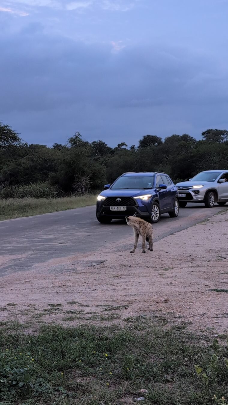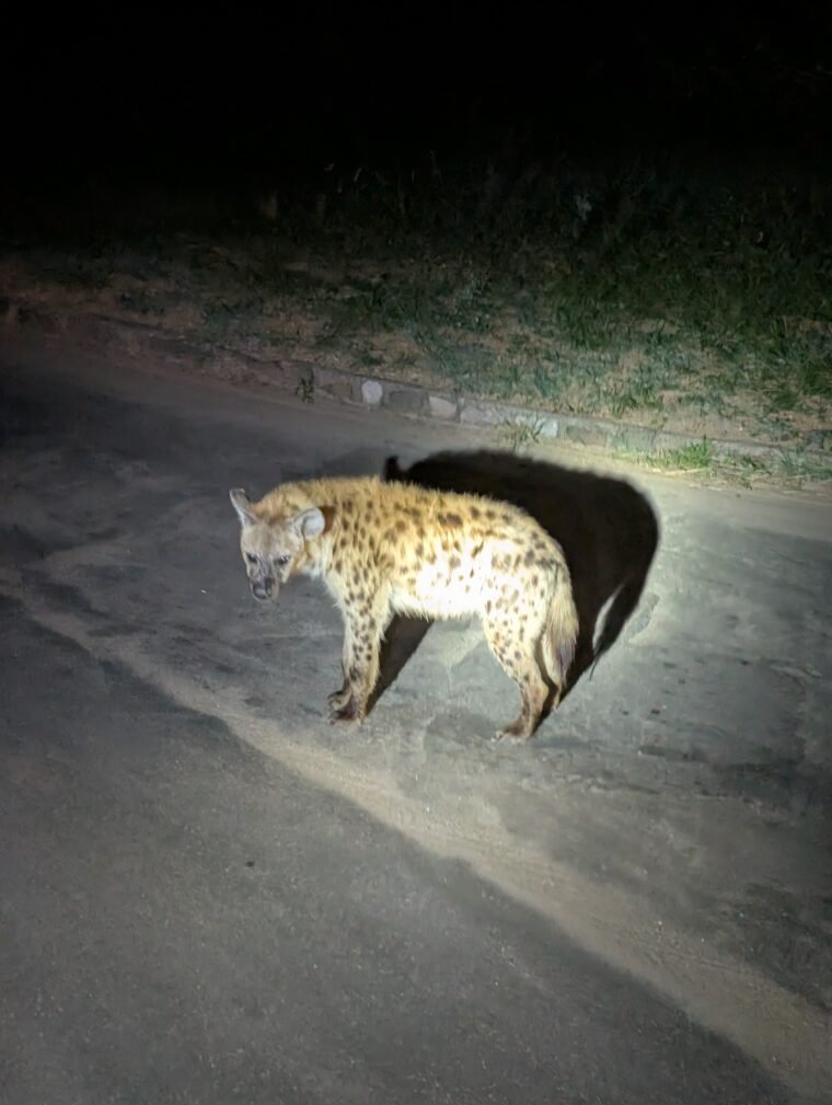 The spotlight swept the bush. The familiar nocturnal chorus began — crickets, frogs, the distant whoop of a hyena (spotted near camp, eyes gleaming in the light, slinking along the perimeter with the guilty energy of a creature that knows it’s up to no good).We took the H4-1 — our faithful road — and crossed the high bridge over the Sabie River. The water glinted below in the moonlight, dark and ancient and alive.