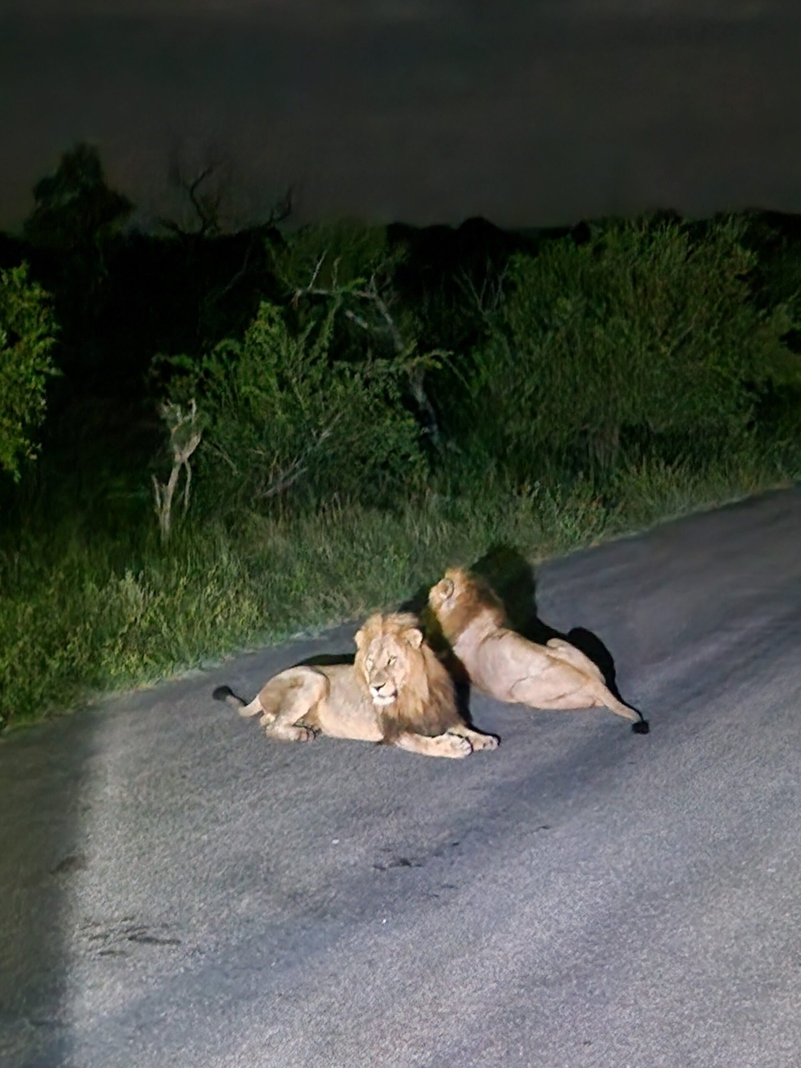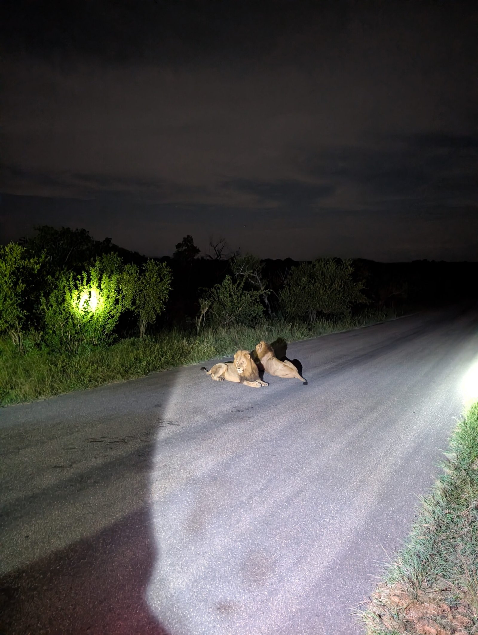 They looked… annoyed. Mildly irritated that our spotlight had interrupted their evening nap. One of them raised his head, squinted at us with an expression of pure, regal disdain — really? — and then laid his head back down with a huff.A second rose slowly, stretched — a stretch that rippled through every muscle in his enormous body — and padded off the road into the bush, where he collapsed back into sleep.