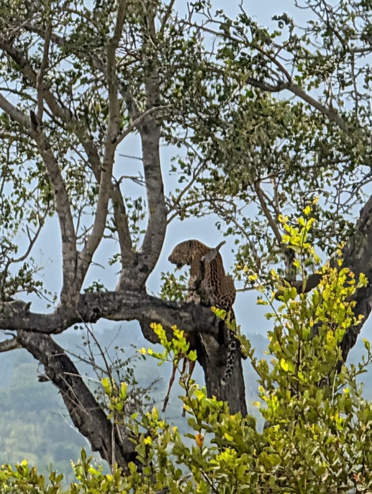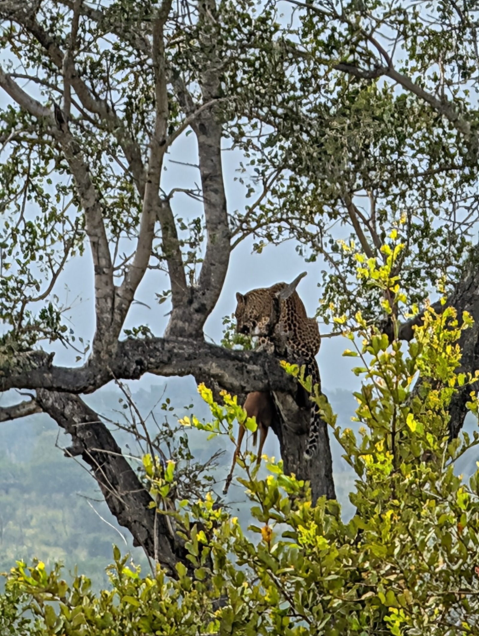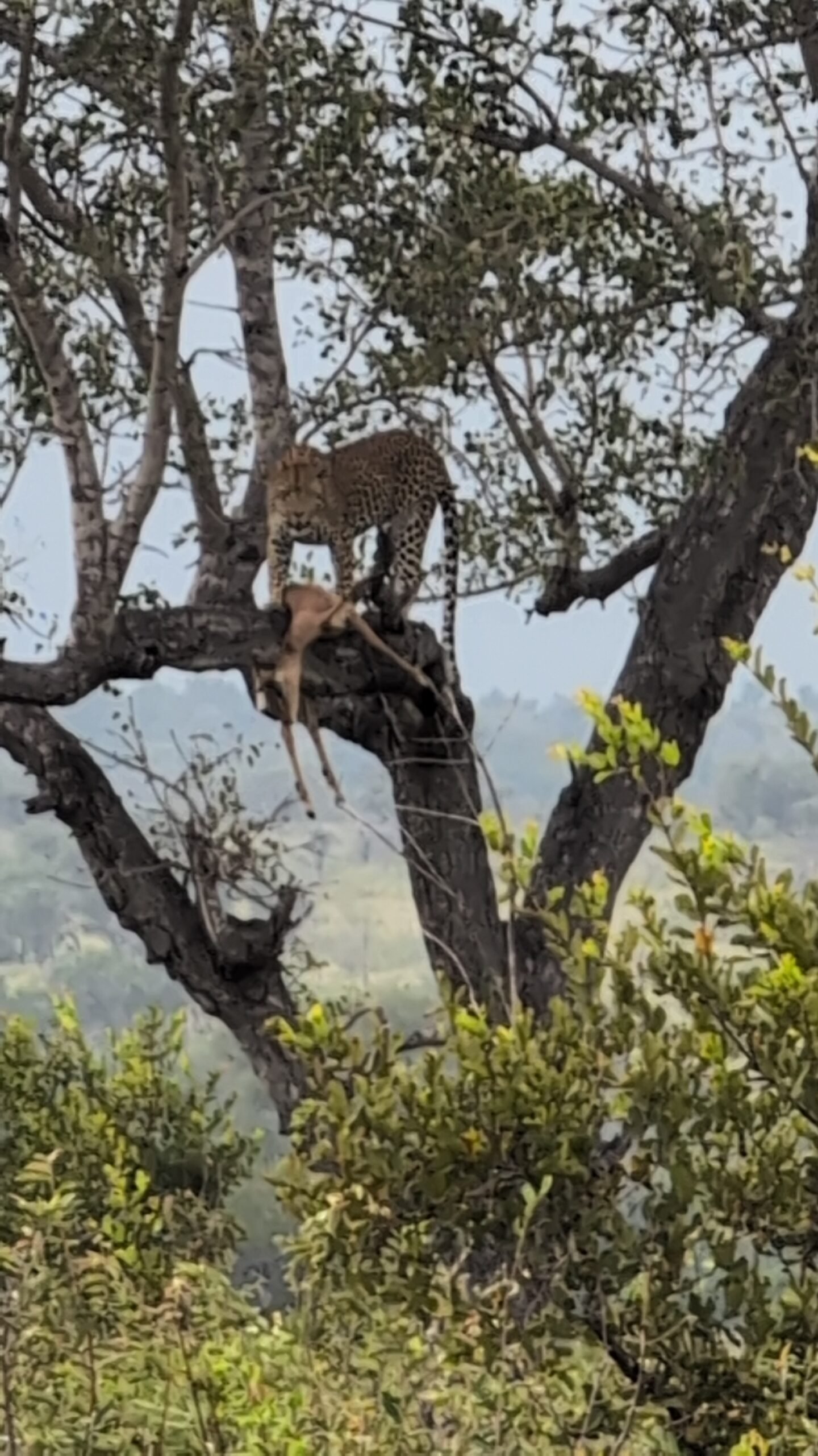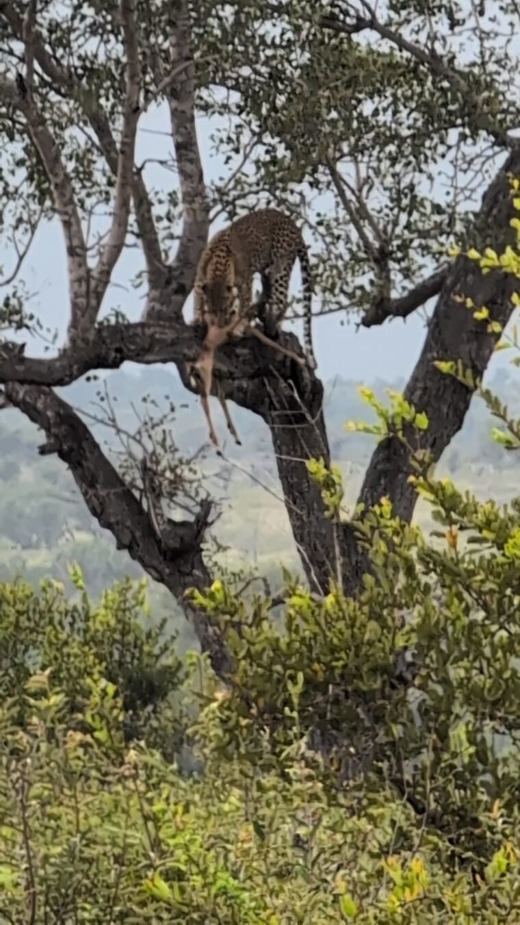 The leopard had hunted, killed, and hauled its prey(Impala) up into the tree — an extraordinary feat of strength that never ceases to amaze. Leopards cache their kills in trees to keep them safe from lions and hyenas, and this one had positioned its meal perfectly: draped across a branch, the impala’s legs dangling, while the leopard moved around it with the proprietary confidence of a chef guarding a prized dish.We watched in awe. Even at a distance, the scene was primal and magnificent — the spotted predator, the lifeless prey, the ancient drama of survival playing out in the African canopy.We kicked ourselves for not having the SLR camera — in our relaxed, “we’re just going for a little drive” mindset, we’d left it in the room. Mobile phones would have to do. The photos were grainy, distant, but the memory was crystal sharp.