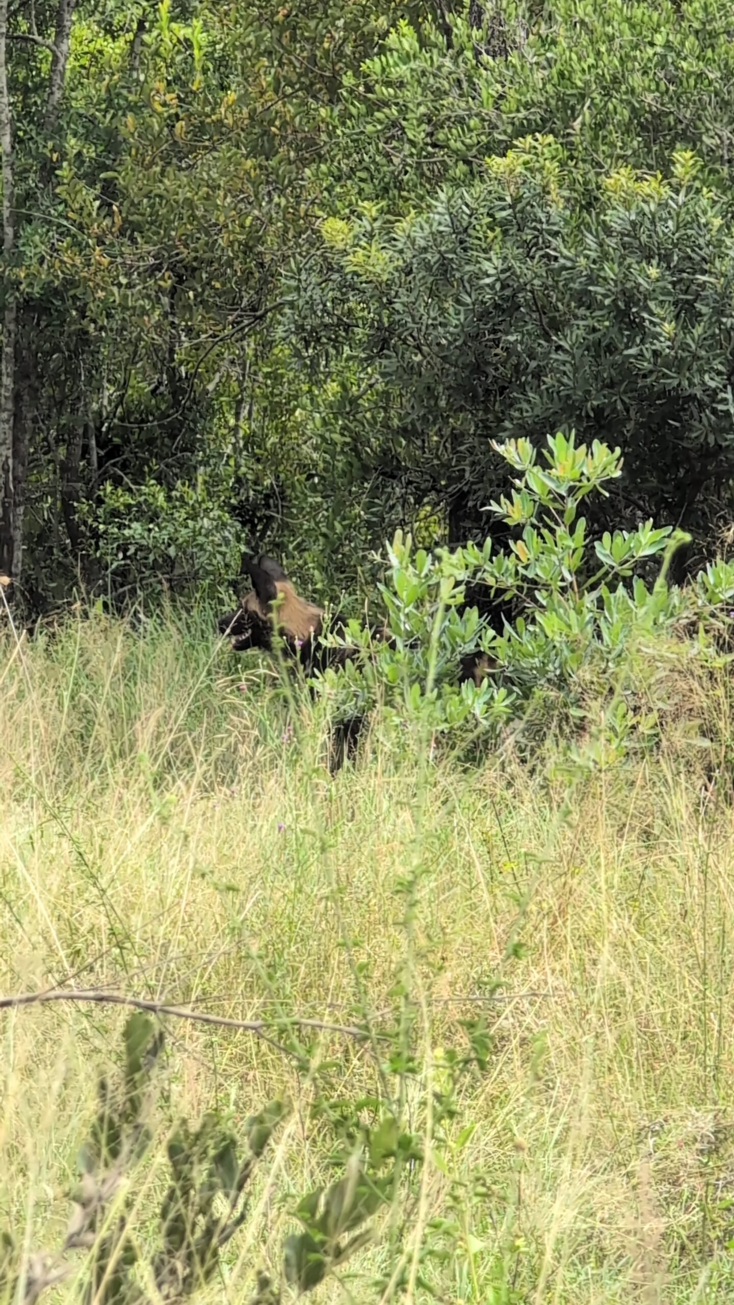 And there they were. At a distance, yes — tucked under bushes, going about their business in lazy circles, clearly resting after a morning of activity. We could see them through binoculars: flashes of mottled fur, the occasional head lift, the distinctive rounded ears.
