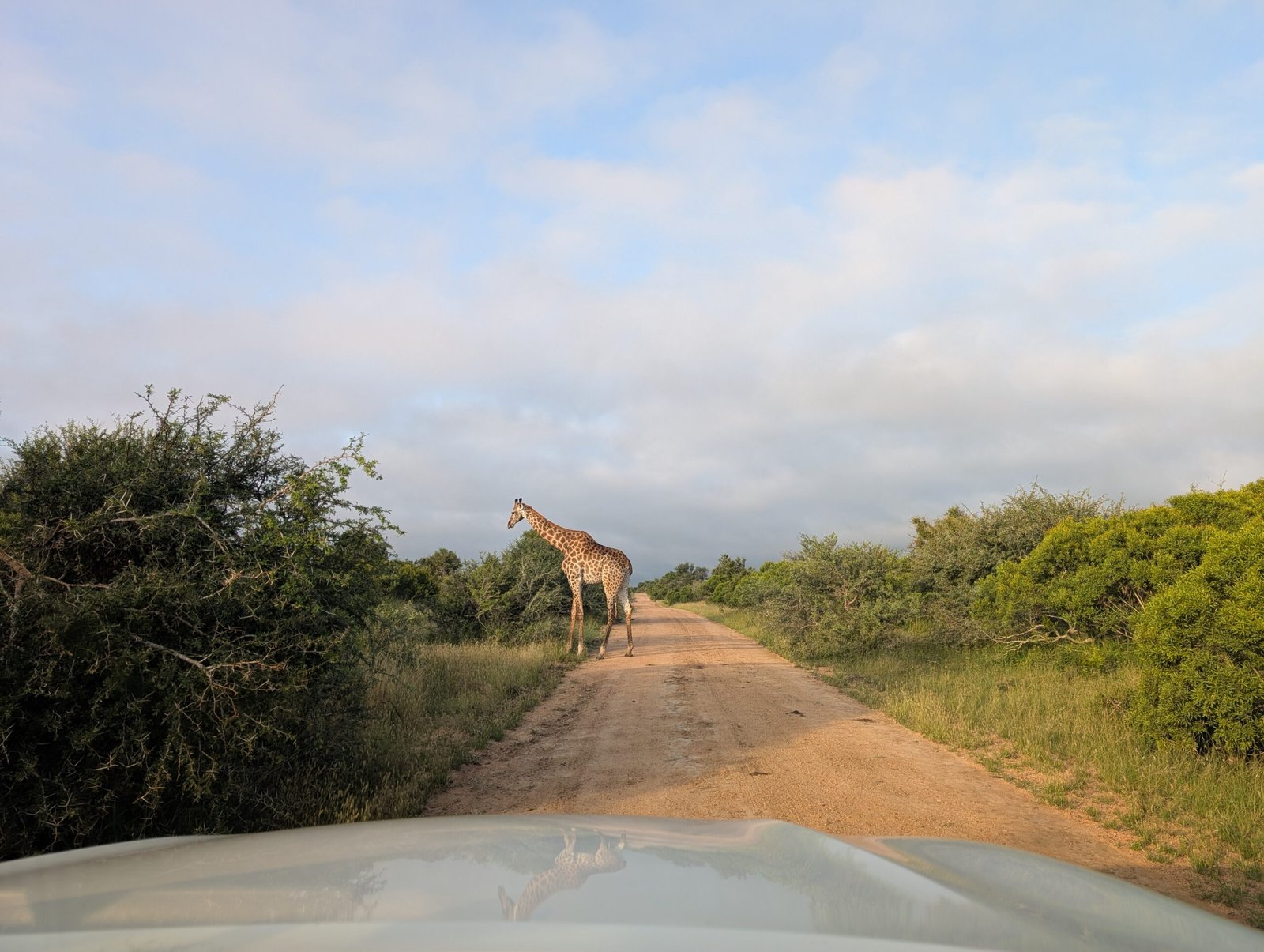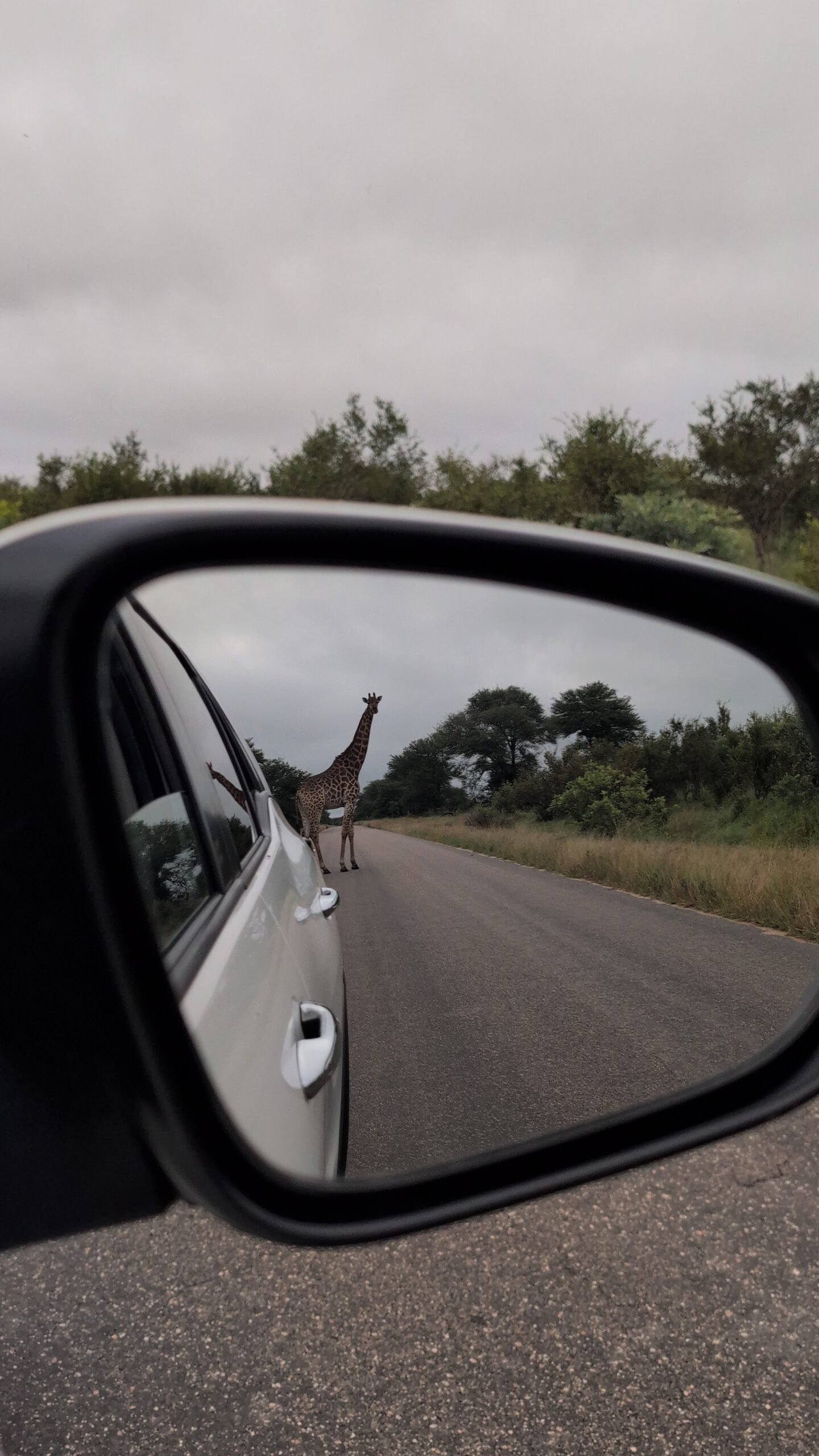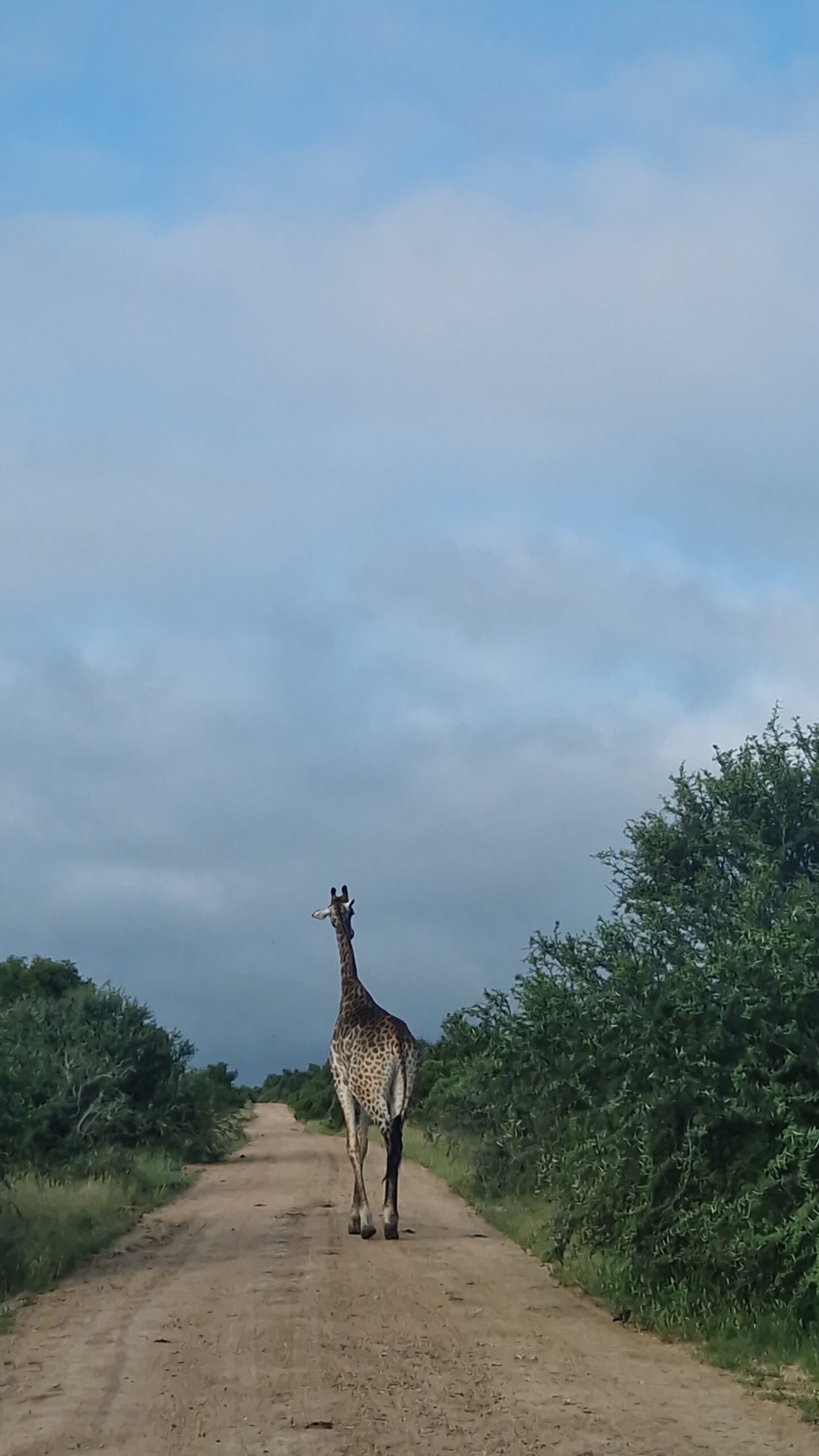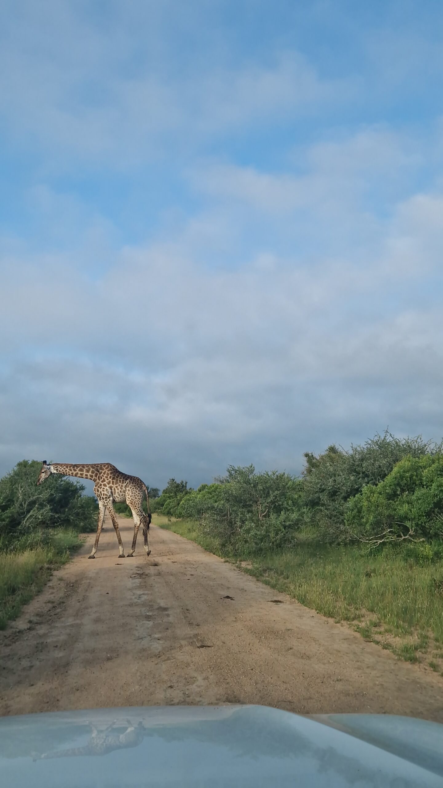 And then — a shape on the road ahead. Tall. Impossibly tall. Moving with the slow, deliberate grace of something that knows it has all the time in the world.A giraffe, crossing the road right in front of us.