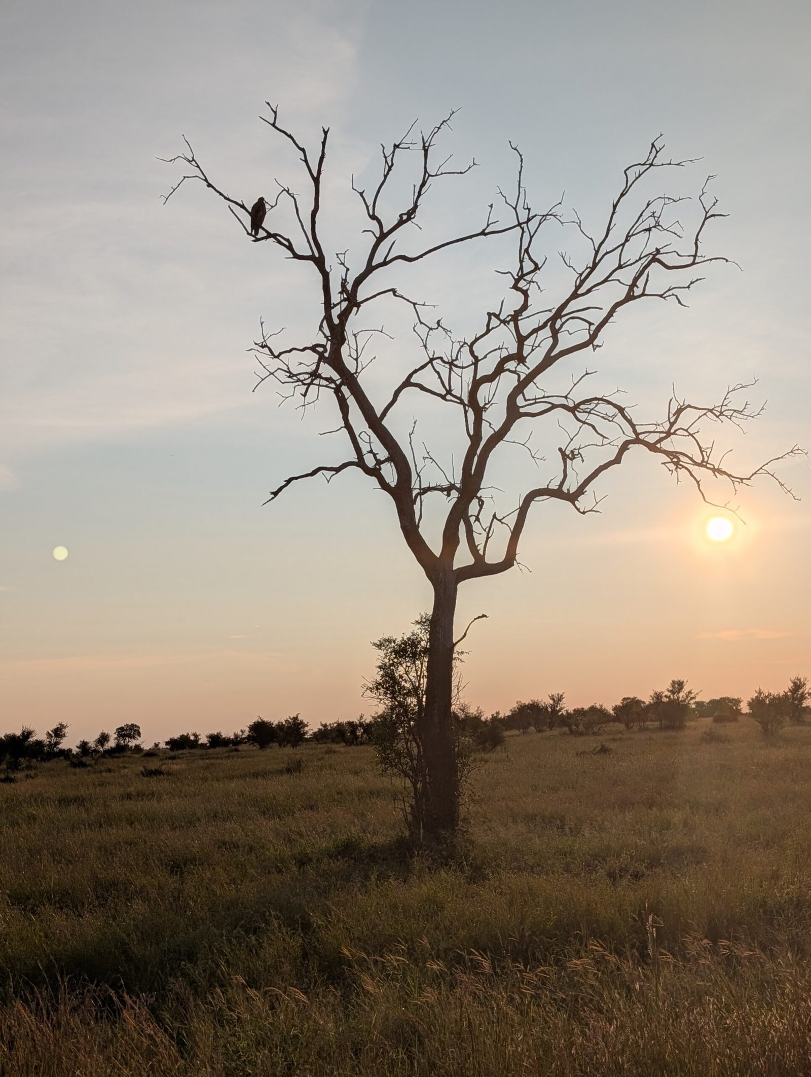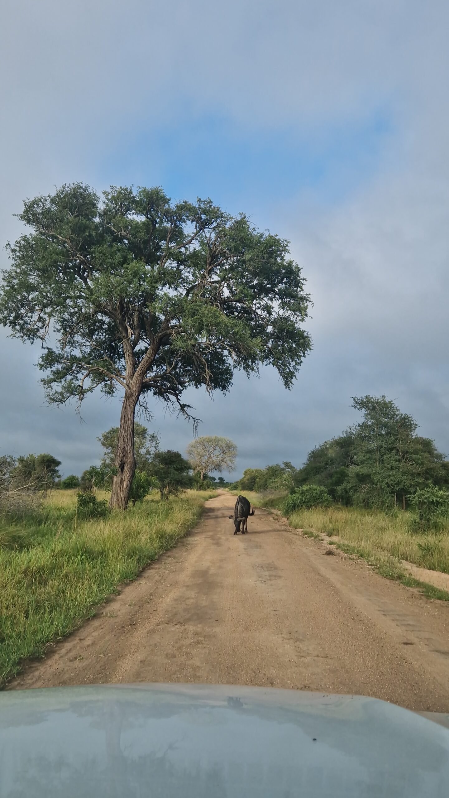 We took the H7 tar road, heading towards Orpen Gate — a well-maintained route that cuts through some of Kruger’s most productive game-viewing territory.And in the early morning light? It was otherworldly.The mist hung low over the bushveld, soft and silver, turning every tree into a silhouette, every clearing into a watercolour painting. The sun hadn’t fully crested the horizon yet, and the world existed in that brief, breathless window between night and day — when everything glows from within.