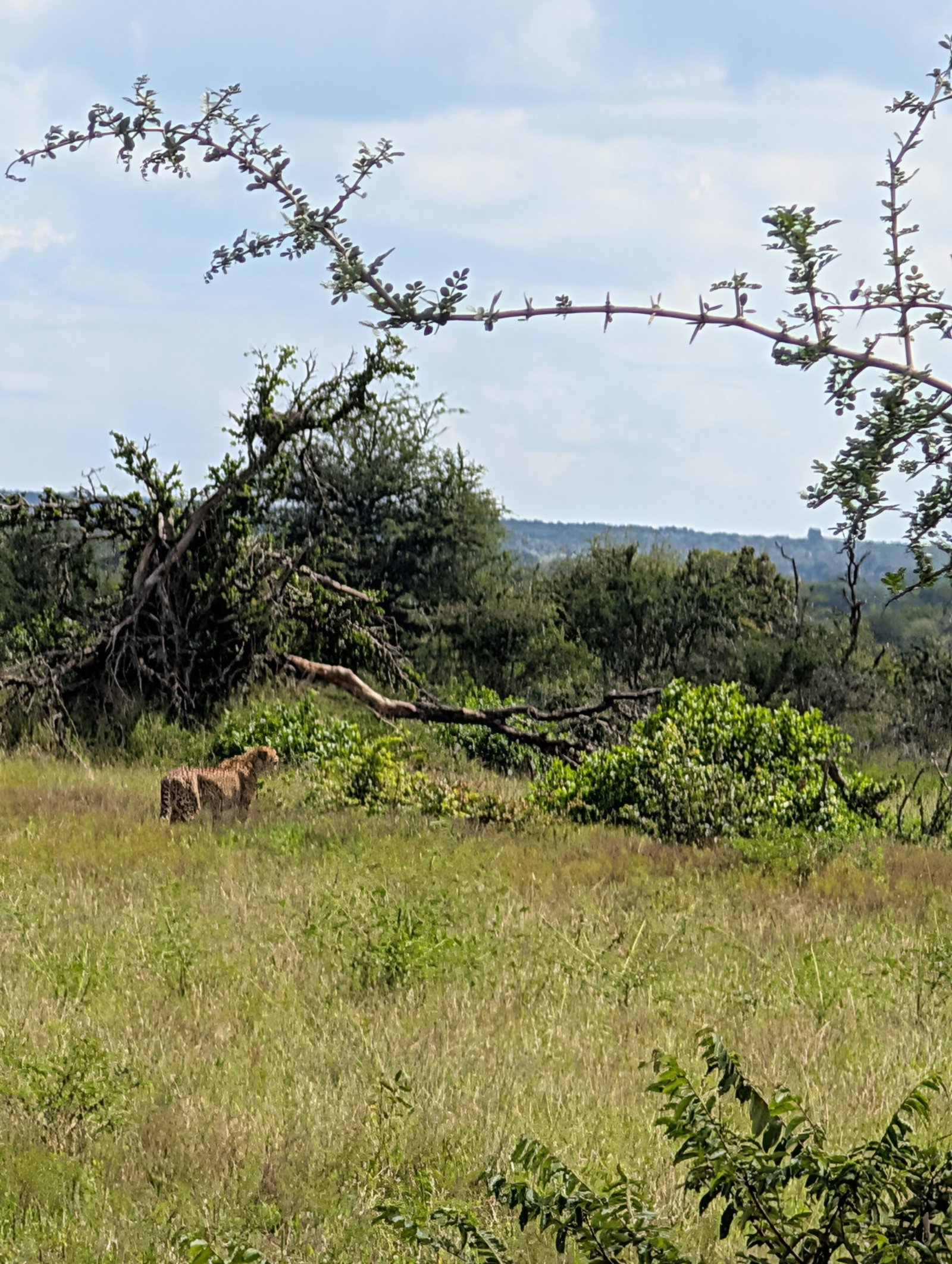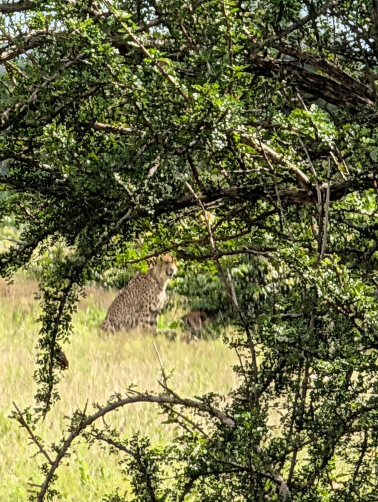 They were resting in the morning warmth, their slender, spotted bodies stretched out in the shade, the unmistakable black tear-lines running from their eyes like war paint. One was lying flat, clearly digesting a meal, its belly round and content. The other sat upright for a while, surveying the plains with those intense, amber eyes — the eyes of the fastest land animal on Earth.The distance was significant — these weren’t the close-up, in-your-face sightings you see on nature documentaries. But through the binoculars, they were magnificent. Every muscle, every spot, every lazy flick of the tail.