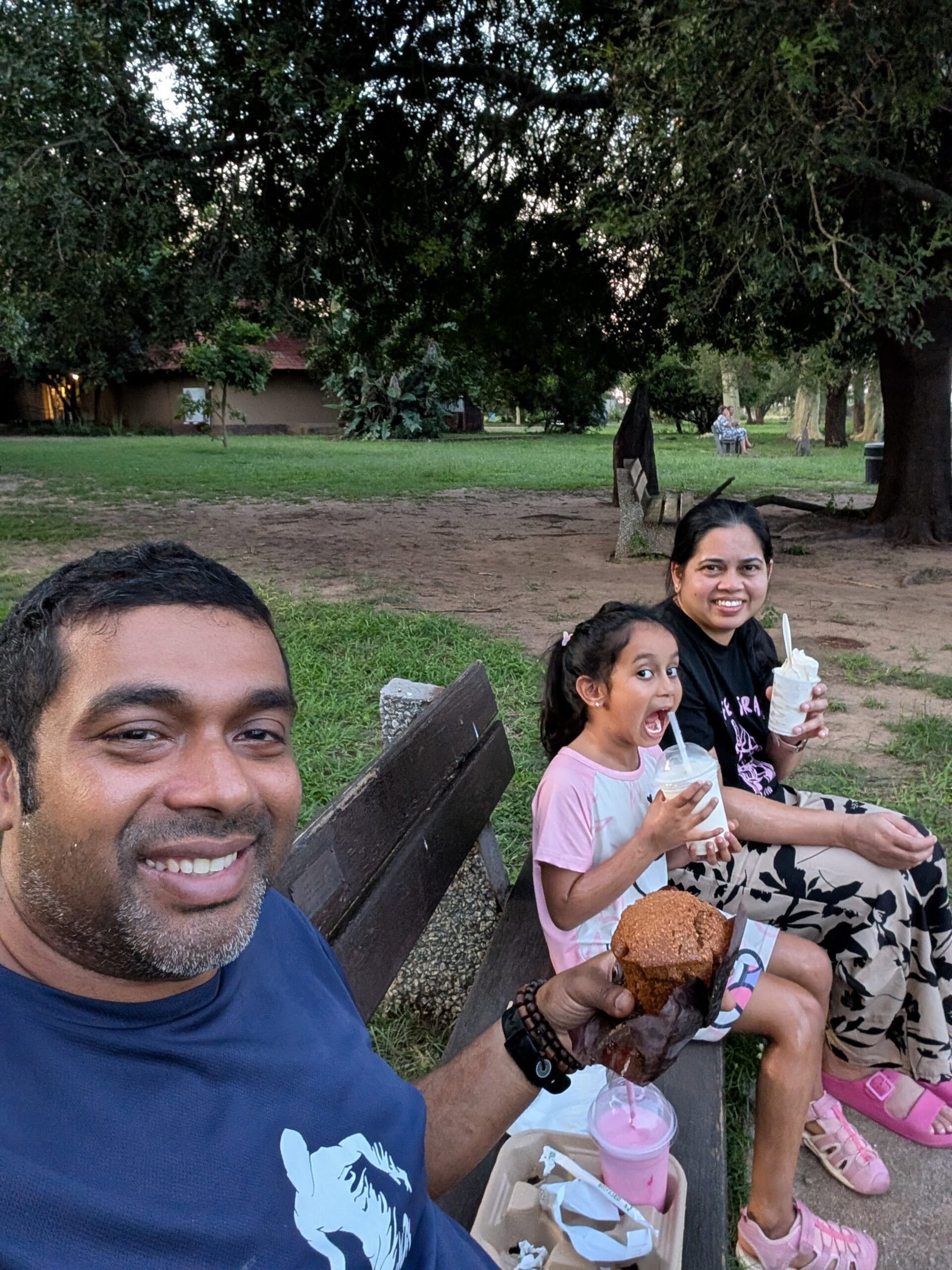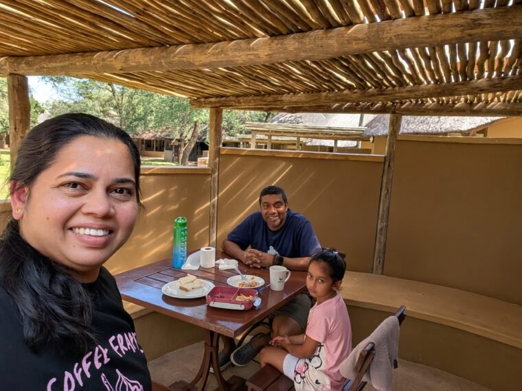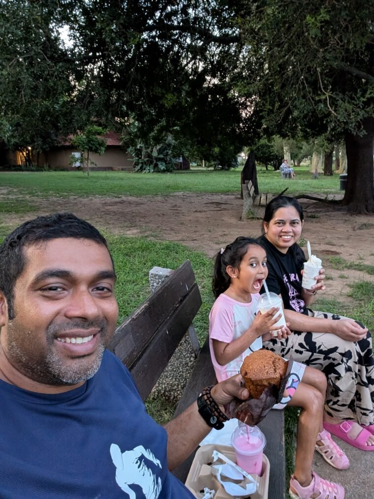 And this, right here, was the moment of the day.Not the cheetahs. Not the giraffes in the mist. Not the solitude of the S106.This. A father, mother and thier daughter, sitting on a wooden bench in the heart of the African wilderness, drinking milkshakes, watching the golden light of late afternoon spill across the savannah, listening to the bush settle into its evening rhythms.